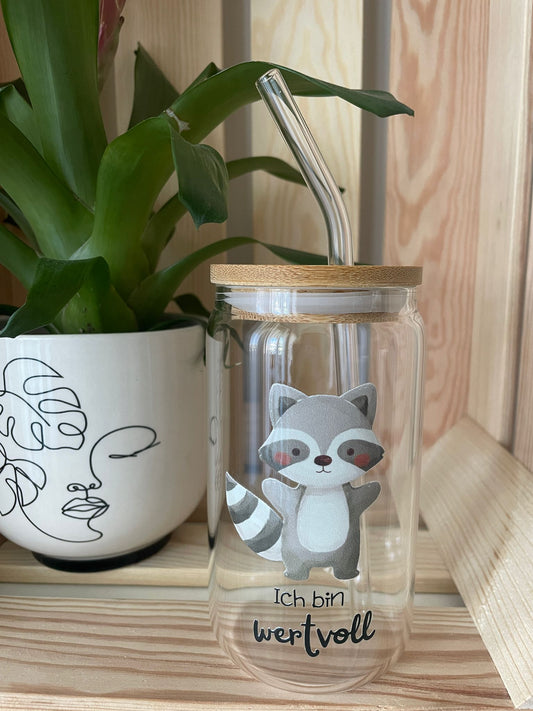 Trinkglas klein: Waschbär mit Affirmationsspruch